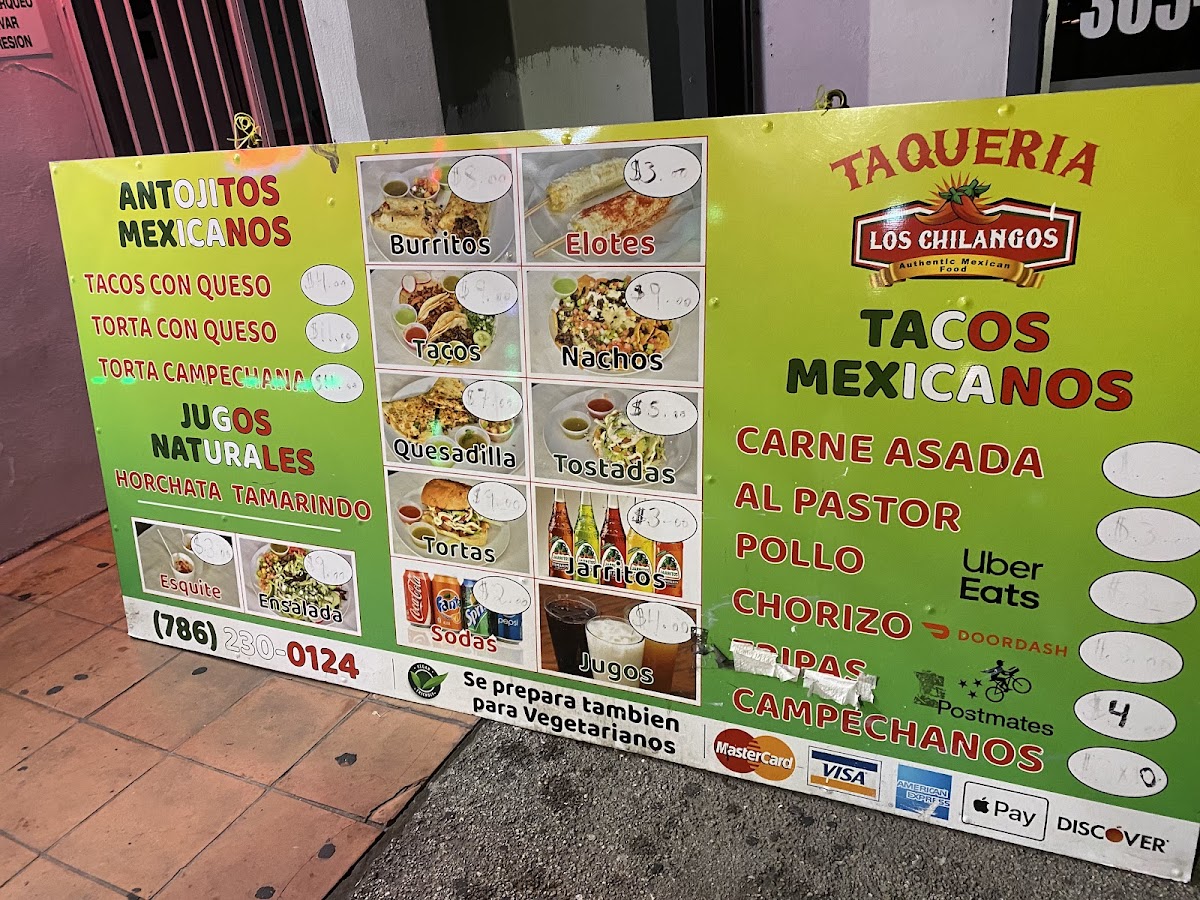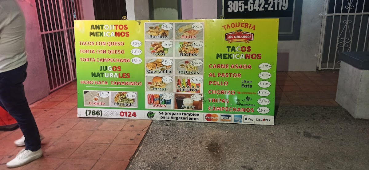 Welcome to Mexican Taqueria Los Chilangos, a vibrant culinary gem tucked away in Miami. Located at 1801 NW 7th St, this taqueria embraces authentic Mexican street food culture. The menu features an impressive variety of tacos starting at just US$2.00, showcasing mouthwatering options like Carne Asada, Al Pastor, and Chorizo. Each taco is crafted to perfection, delivering a burst of flavor that transports you straight to the bustling streets of Mexico.